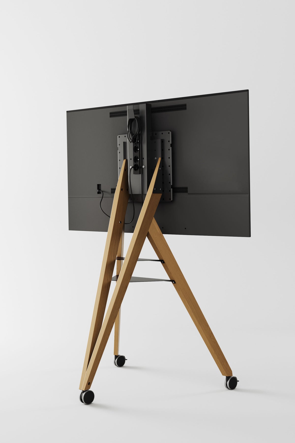 Il nostro robusto, elegante e mobile supporto per monitor costituisce la base del sistema. Ciò consente un posizionamento flessibile del monitor all'interno della sala, garantendo a tutti i partecipanti una visione ottimale dello schermo. Per eliminare rapidamente i riflessi sul monitor causati dalla luce ambientale, è sufficiente regolare leggermente l'angolazione rispetto agli spettatori. La mobilità del supporto consente di spostare facilmente il sistema AV da una sala all'altra per supportare conferenze in ambienti diversi.